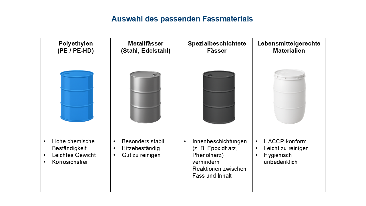 Die Wahl des richtigen Fassmaterials ist entscheidend für die sichere und effiziente Lagerung sowie den Transport von Flüssigkeiten. Verschiedene Materialien bieten unterschiedliche Eigenschaften und eignen sich für spezifische Einsatzbereiche.